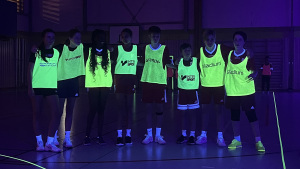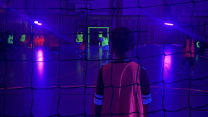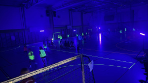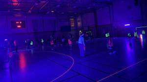 Detta år bjöd vi på något extra. Hallen var släckt, men lystes upp av UV-ljus och linjerna, västar och bollen lös som neon. Vi blandade lagen och spelade neonhandboll tillsammans.